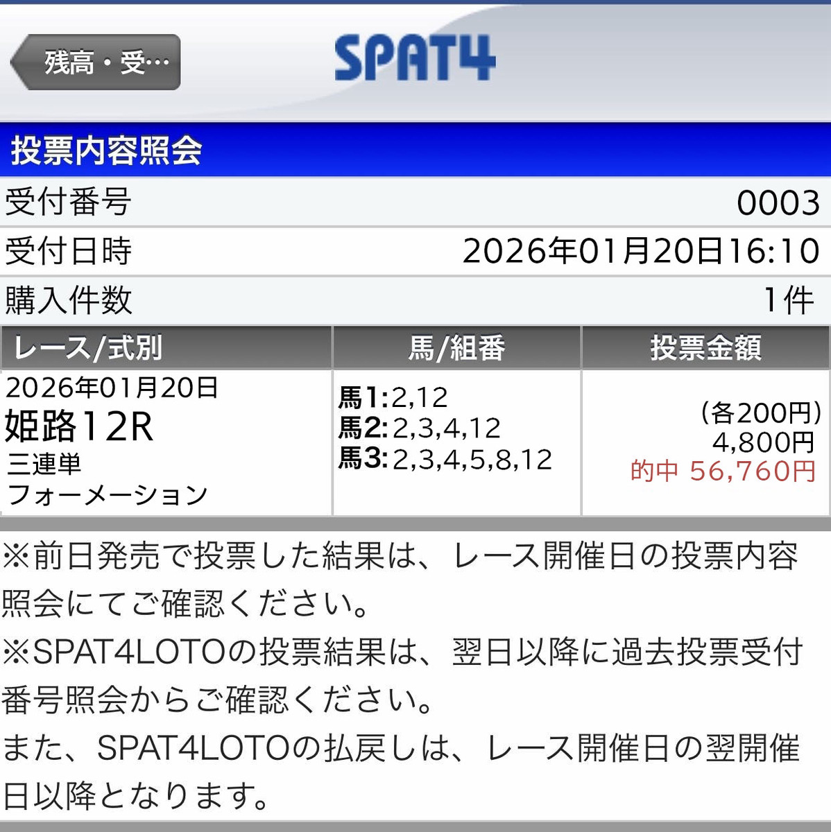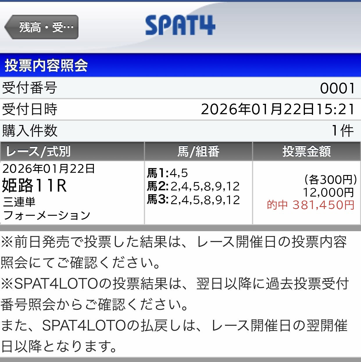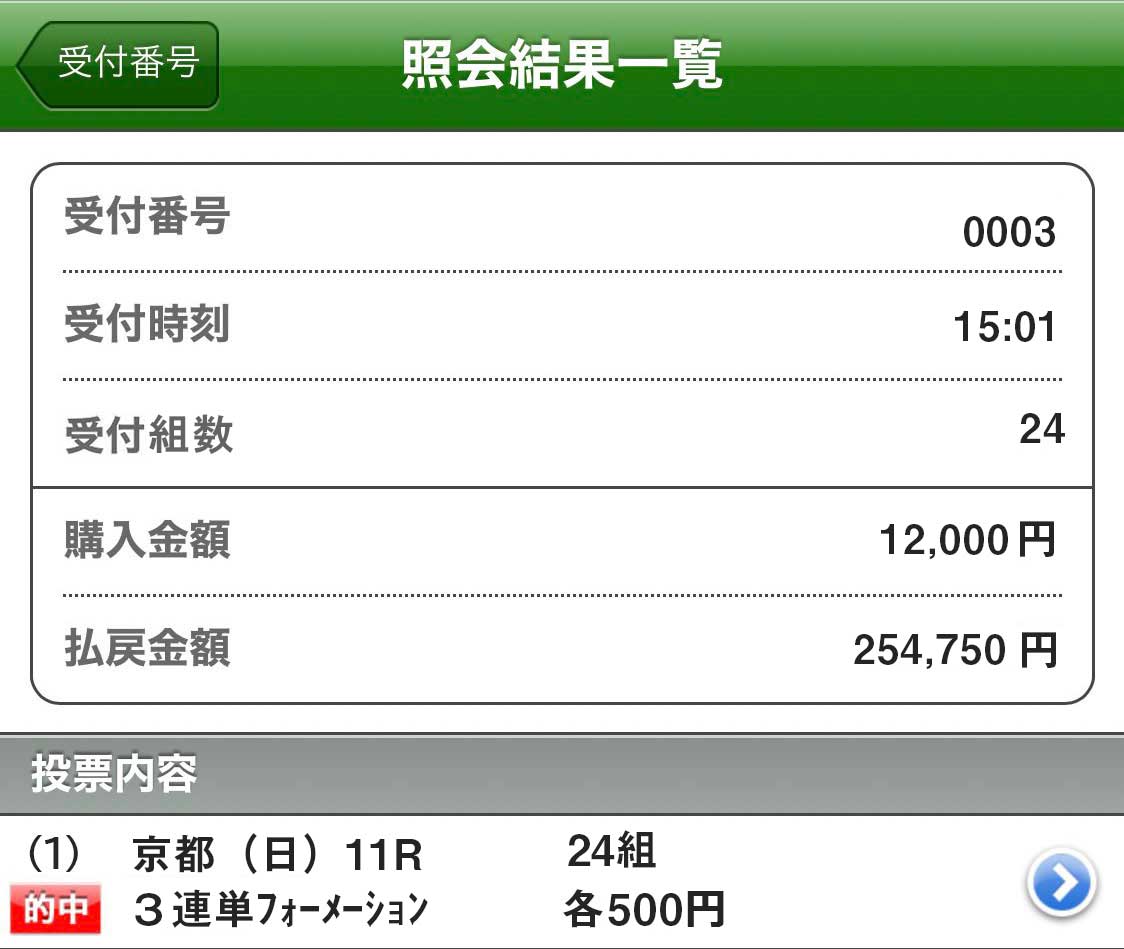 決して高配当とまでは(100万円以上)とはいきませんが 堅実的に10~20万円前後の配当的中してます。 今年、金杯開催週から3週連続で的中しているので明日も楽しみです、この一番新しい的中は27万3490円払い戻しでした。