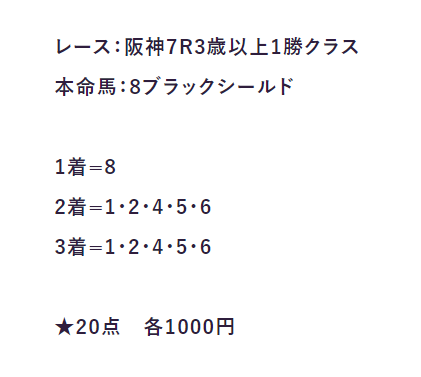 土曜日の阪神の予想がこれ!20000円も買わせといてセンスのなさすぎて外した笑