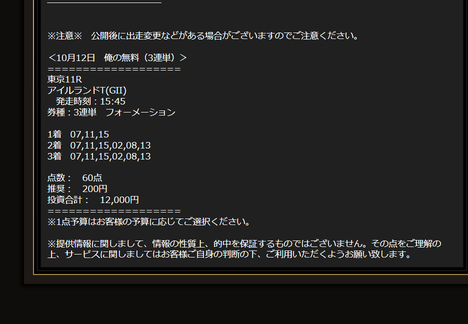 俺の競馬ってサイトは知っていたけど、俺の競馬内にLINE限定無料情報があったのは知らなかった… 昨日の月曜コンテンツの下の部分に紹介されててさっそくLINEも登録したわ。 先週7万損した気分だわ…
