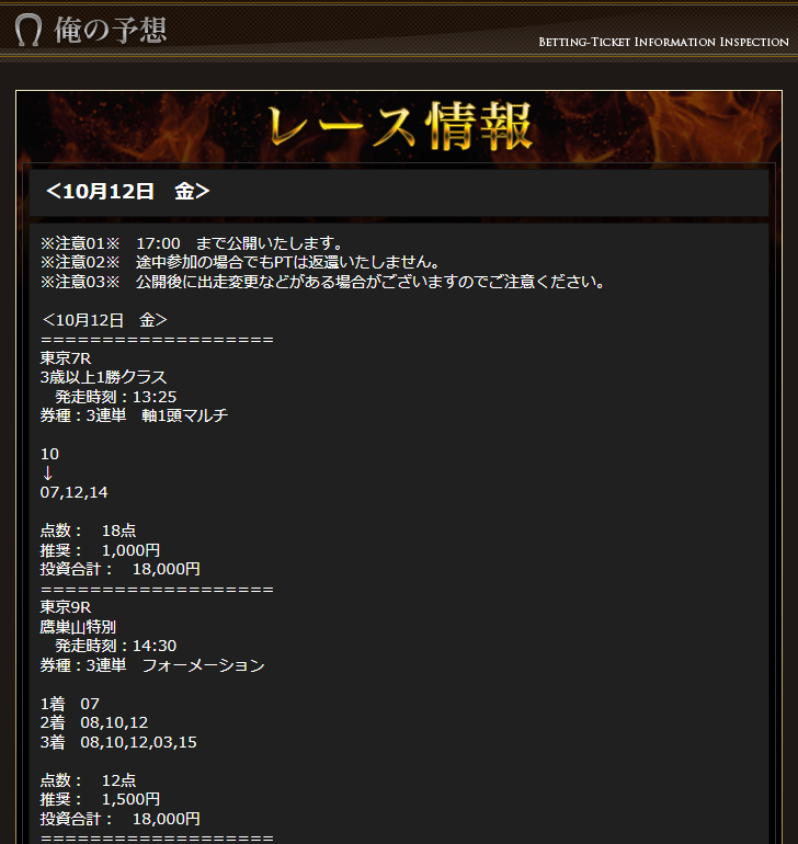 2レース検証結果です。 東京7R→3064.0倍的中 東京9R→413.6倍的中 ------------------------- 合計馬券代→36,000 ------------------------- 東京7R→3,064,000円獲得 東京9R→620,400円獲得 ------------------------- 合計配当→3,684,400円 馬券費用→36,000円 ↓↓↓ 収支→+3,648,400円 回収率→10234.4% アイビスサマーダッシュの3連単無料予想で258.3倍的中から的中結果をずっと見て、いざ実際に使ってみたら破壊的な配当でした、1カ月以上使わなかった期間が勿体なかったです、この予想は暮れの有馬記念、ホープフルまで絶対に使えます。