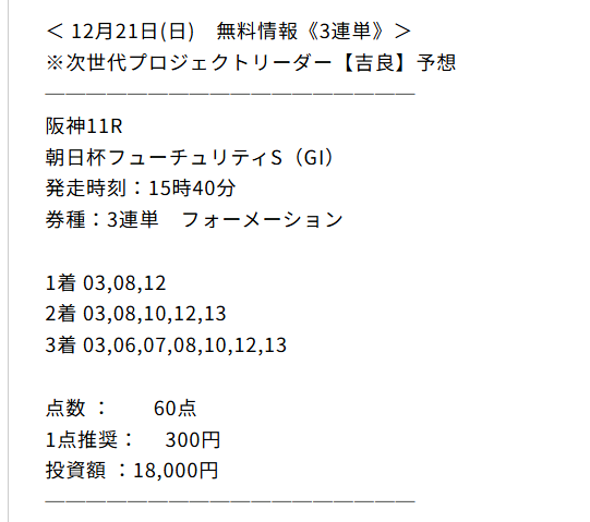 おかげさまで無料情報≪3連単≫予想で万馬券大当たり!! 阪神ジュベナイルフィリーズ3連単⑨-⑤-⑰的中で301.8倍! 1点300円でもそこそこ付いたから9万540円払い戻し! クゥー!年末に向けてツキが向いてきてるぜ!